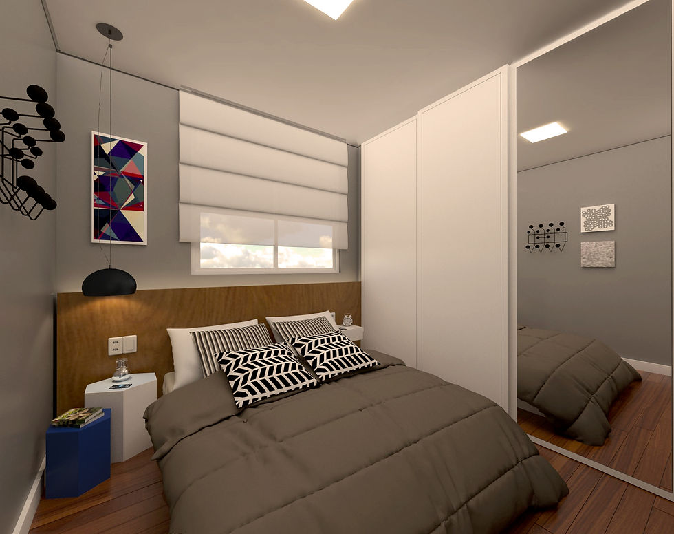 No quarto do casal, optamos por elementos simples e econômicos que agregassem valor à decoração. O espelho, localizado em apenas uma das portas, amplia o quarto e serve para visualização de corpo inteiro, já que fica no espaço entre a cama e a parede.